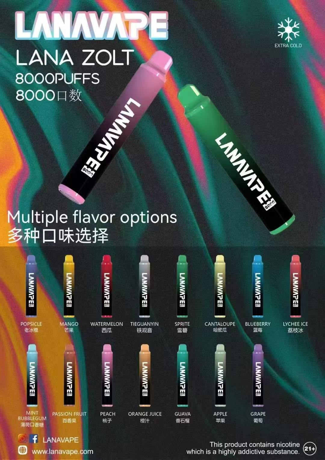 選擇LANA ZOLT 一次性霧化器,享受17種精選口味,一次性電子菸8000口持久享受。